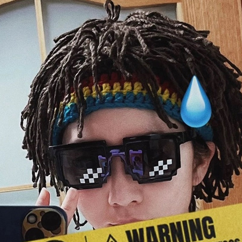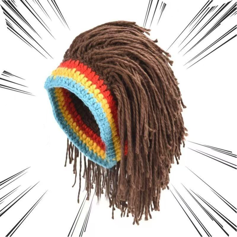 Ready to turn heads at your next festival, rave, or Halloween party? This hand-crocheted knit hat blends vibrant rainbow stripes with playful faux dreadlock fringe for that iconic hippie-reggae vibe 🎶.